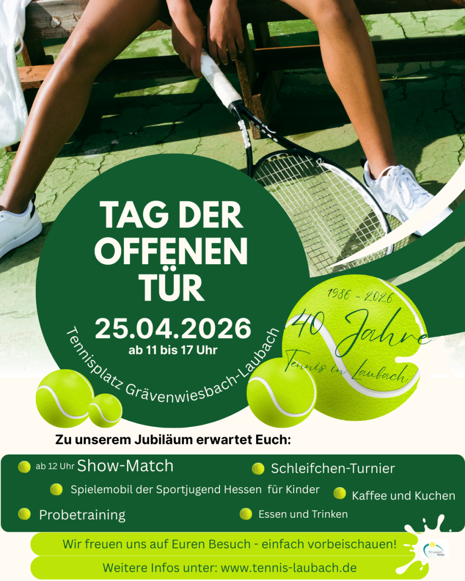 Zum 40-jährigen Jubiläum lädt der Verein alle Interessierten herzlich ein, mitzufeiern und die Tennisanlage kennenzulernen. Am 25. April 2026 von 11 bis 17 Uhr findet auf dem Tennisplatz in Grävenwiesbach-Laubach ein großer Tag der offenen Tür statt.